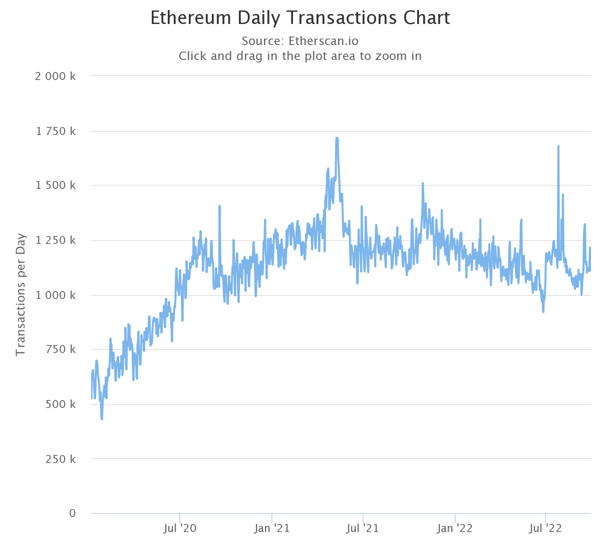 According to the data of Etherscan, the daily transaction number on Ethereum has mostly been more than 1M since around July 2020, shown in the chart below.