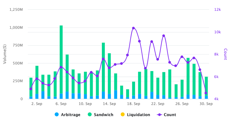 Among these 1 million transactions, thousands are MEVs including arbitrage, sandwich, and liquidation. The following chart was captured from https://eigenphi.io/, from which you can tell that the daily MEV number is usually less than 10K.