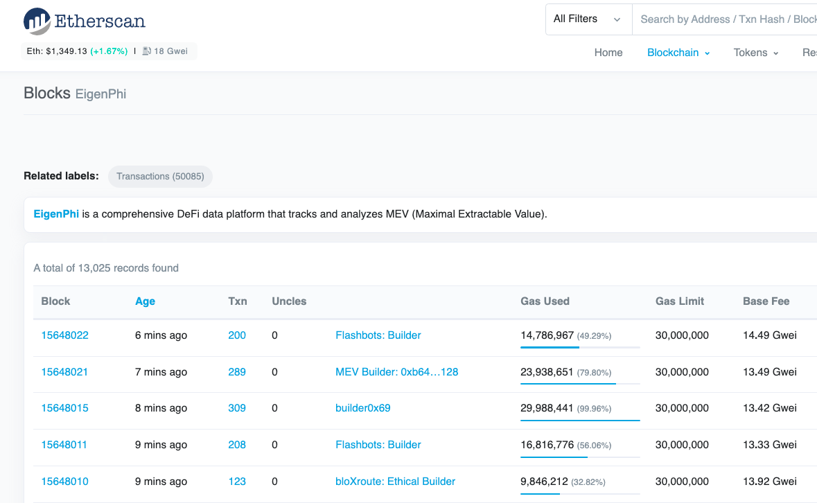 Click the “Block,” and you will be directed to the block list page showing all the blocks containing MEV identified by EigenPhi. We can read that there are 13,025 such blocks.