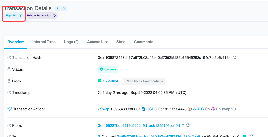 Using EigenPhi’s API and data, Etherscan has added a label-EigenPhi-to the transaction detail page: