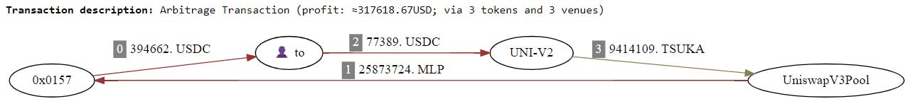 The arbitrage with the highest ROI this week earned $317,618.67 with 1,969,106.65%. It’s a classic arbitrage coducted in 3 different adderesses.